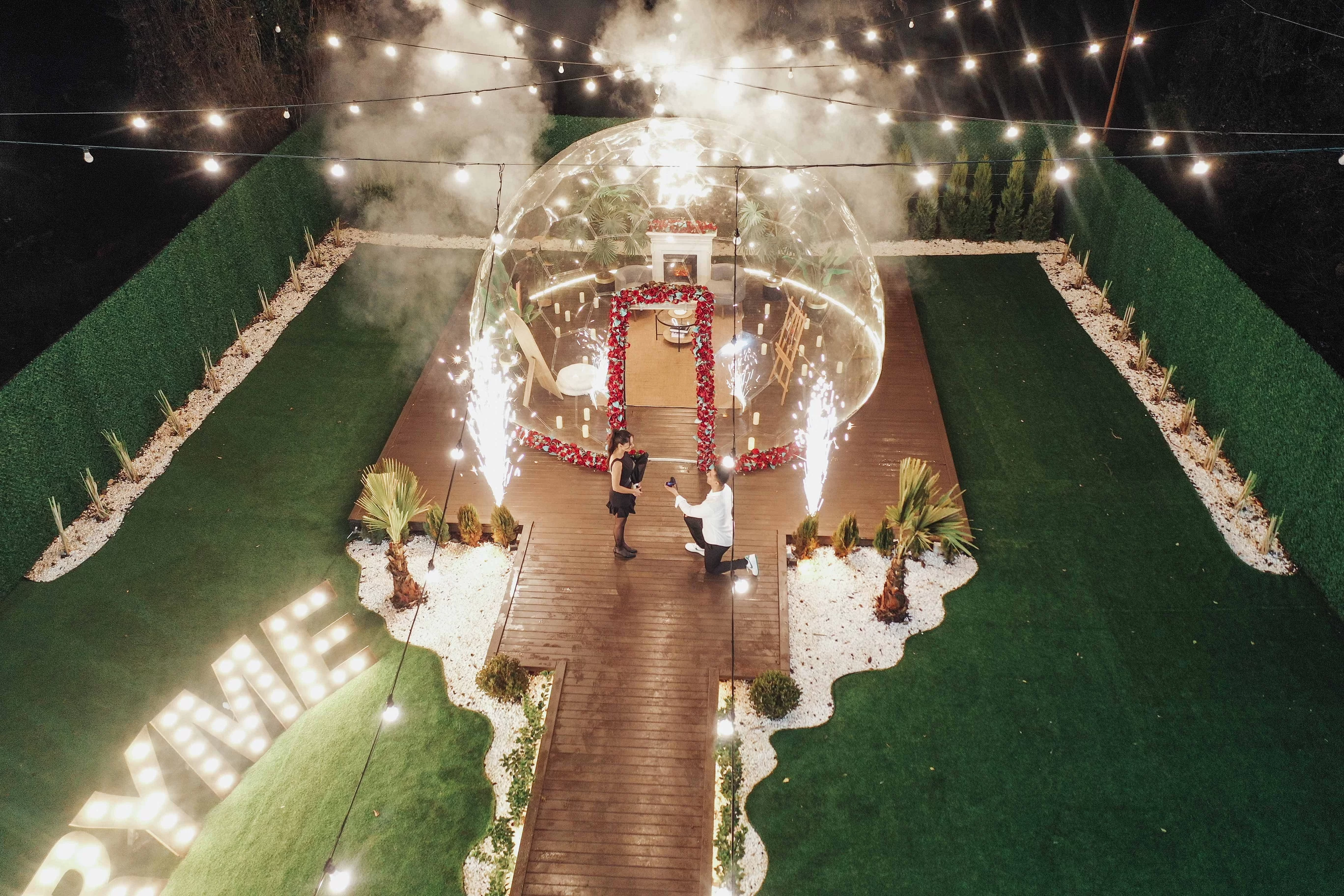 Kalp şeklindeki balonlarla dolu bir ortam veya “Benimle Evlenir Misin?” yazılı ışıklarla süslenmiş bir alan hazırlayabilirsiniz.